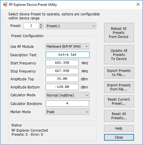 The RF Explorer Preset Manager tool can be used in Connected and Disconnected mode. Connected mode is required to update the RF Explorer device, but Disconnected mode is useful to manually define presets that can be later uploaded to one or more RF Explorer devices.