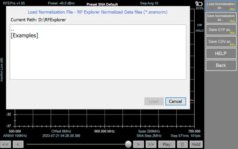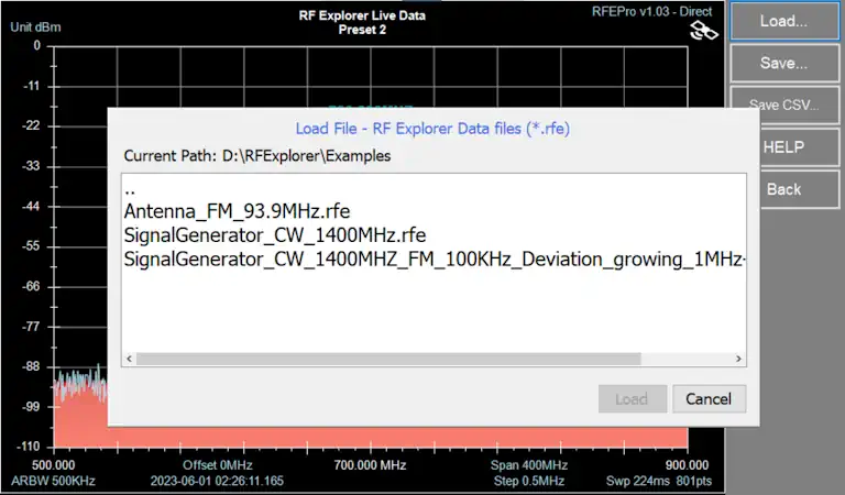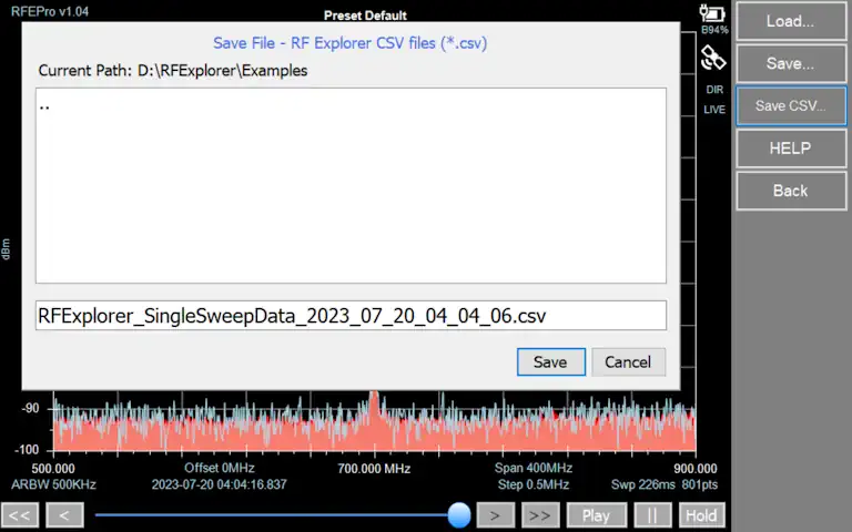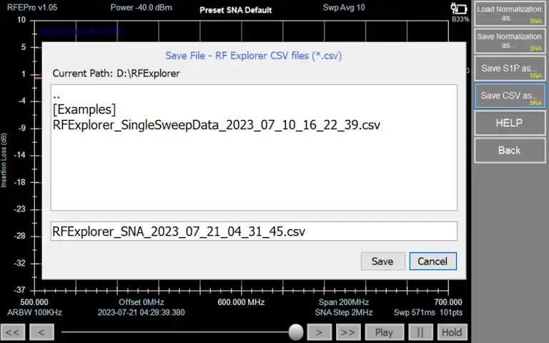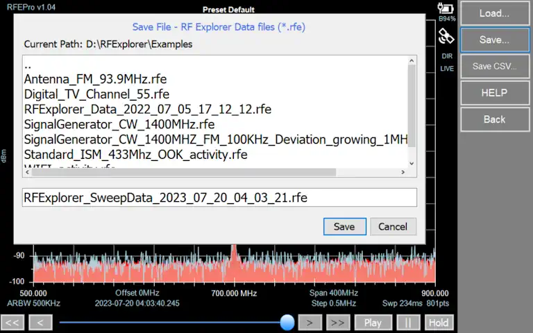 By default files are stored in USB removable drive if available, otherwise the target directory will be “MyDocuments\RFExplorer”