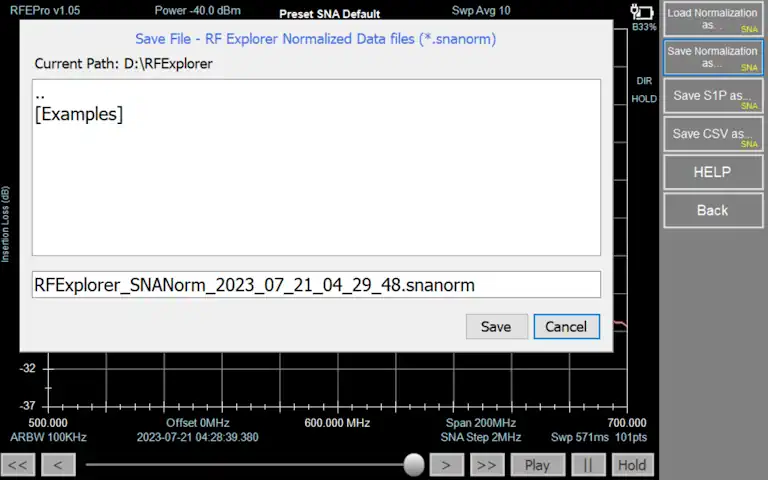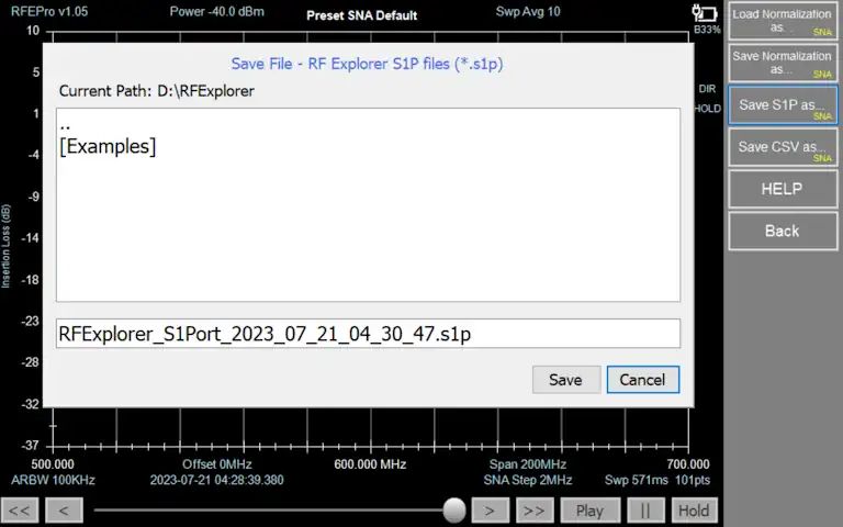 To save tracking S1P file, go to File -> Save S1P as… and select desired directory to store file, typing a name for it.