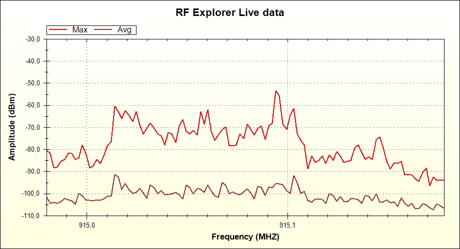 As we configured RF Explorer to calculate Max of every sample, we are displaying the signal spectrum envelop with both zeros and ones together, regardless the zeros being more frequent (or dominant) than the ones.