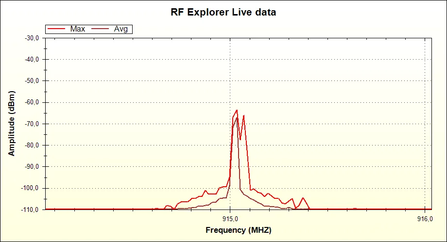 The PC client, thanks to a better screen, show us the Max signal spectrum envelop as we saw it initially in the RF Explorer screen, but at the same time the Average value show us very clearly how the “zero” peak is way more frequent than the “one”. We are looking in the same graph, with great clarity, what we did in the RF Explorer screen with two different configurations. You know.... the PC is here to help!