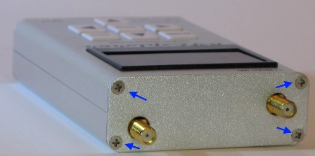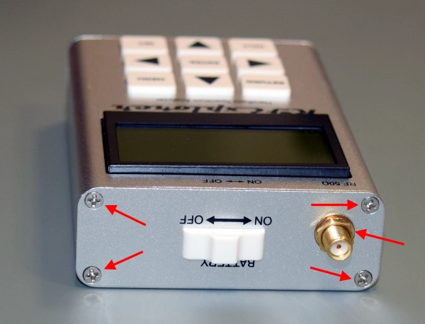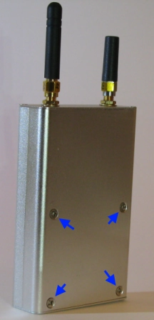 Then remove the antenna, the SMA nut and washer. Remove also the 4 screws marked with red arrows below.