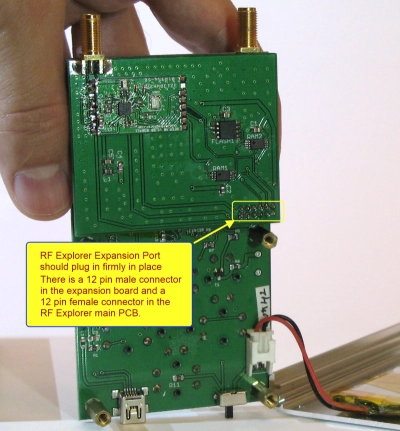Before following this process, be sure you upgrade the RF Explorer firmware the latest available version from the download page. The firmware upgrade must be done before you install the hardware Expansion Module.