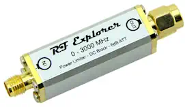 Note: RF Explorer is a very sensitive spectrum analyzer, specially designed to detect signals with aerial antenna. For extra protection when connecting the analyzer to a signal source with a coaxial cable, we suggest using a RF Explorer Power Limiter. More details at www.rf-explorer.com/PLIMITER