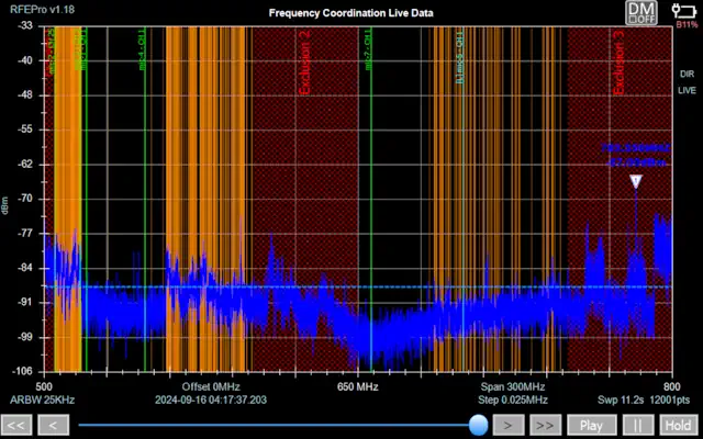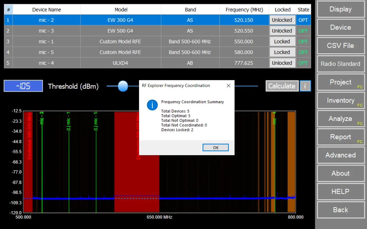 If necessary, set exclusion frequency ranges to avoid coordinating devices within these frequencies. You can also easily exclude TV channel stations, starting from the current known location.
