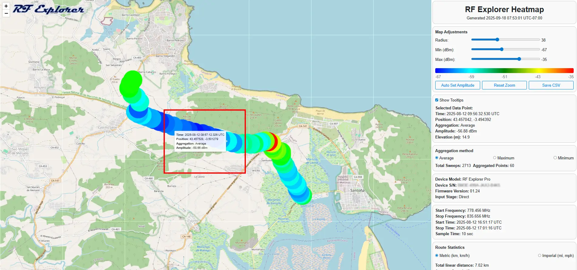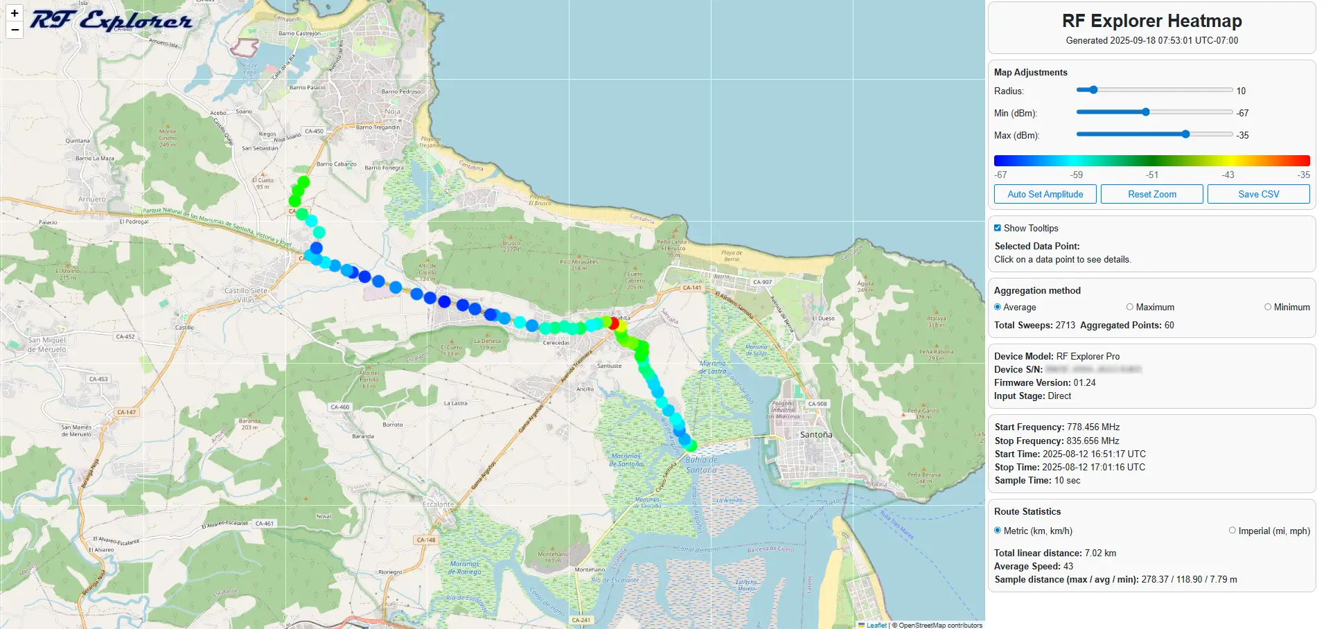 Selected Data Points: This section is interactive. When you click on a specific data point or area on the heatmap, detailed information about that particular measurement (such as exact frequency, signal strength, timestamp, and GPS coordinates) will be displayed here.