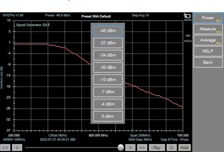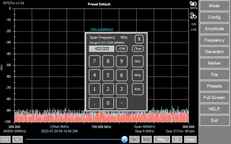 RF Explorer Pro Frequency and Amplitude configuration
