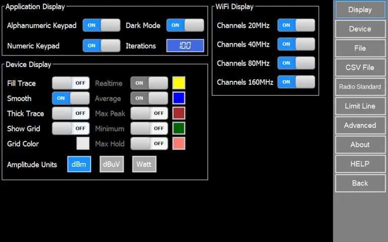 For the 5GHz and 6GHz WiFi bands, you can select which channels to display by navigating to Config > Display in the menu. From there, choose between the available channel widths: 20MHz, 40MHz, 80MHz, or 160MHz.
